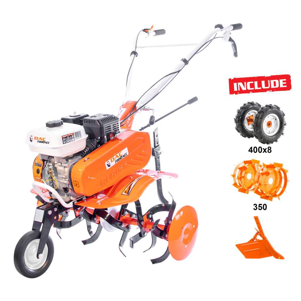 | Tartozék | Gumi kerék 4.00-8, fém kerék 350, töltögető eke |